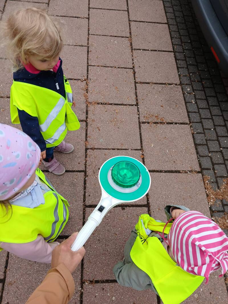 Nach dem wir den Verbandskasten aus dem Auto erkunden durften und wissen das wir bei einem Notfall das Einsatzfahrzeug den Krankenwagen mit Ta Tü Ta Ta in Verbindung bringen dürfen, erforschen wir seit kurzem einen weiteren Fachbereich der Ta Tü Ta Ta Arbeitsgruppe. Am Anfang der Woche konnten einige Kinder und auch ich auf dem Weg zur Betreuung, große technische Geräte am Straßenrand beim Kindergarten im Dorf entdecken. Jedoch wussten die Kinder noch nicht was das ist. Da das Thema Ta Tü Ta Ta- die Polizei ein großes Thema ist und vieles zu erkunden gibt, habe ich die Chance der Spontanität ergriffen und wir haben uns nach dem Frühstück für einen Spaziergang angezogen. Die Kinder waren sehr aufgeregt, da wir im Morgenkreis darüber gesprochen haben, dass wir zum großen Kindergarten laufen werden und ich ihnen dort etwas zeigen möchte. Für die bessere Erkennung und Sicherheit im Straßenverkehr zogen wir auch unsere tollen Warnwesten des Tageselternverein der Kindertagespflege Schwalm- Eder- Kreis an. An unserem Zielort angekommen, zeigte ich Ihnen erst den zivilen Arbeitsbus und die vielen Kabel, die am Straßenrand zu den technischen Geräten verliefen. Die Geräte haben wir uns mit Vorsicht und Respekt und einem komischen Bauchgefühl ganz nah angeschaut. Als ich ihnen erklärt habe, dass diese Geräte die schnellen Autos auf der Straße fotografieren, ließ bei einigen Kindern die Aufregung nach. Wir beobachteten einige Zeit die Autos und konnten feststellen, dass es gerade nicht viele Autos gibt, die zu schnell fahren. Auch der Polizist, der im Arbeitsbus saß ist für uns kurz ausgestiegen und hat uns gesagt das die Autos heute, dem entsprechendem Tempo fahren. Er erzählt uns das er für die Kindergartenkinder, die Schulkinder und auch für uns immer mal wieder hier steht um die schnellen Autos zu fotografieren. Er sorgt für die Sicherheit im Straßenverkehr. Er zeigte uns auch die Handkelle womit die Polizisten immer mal wieder arbeiten und ebenso seine leuchtende Jacke und Warnweste, die die selben Farben haben wie unsere. Diese Entdeckungstour war für alle ein tolles Erlebnis und die Kinder konnten somit eins von vielen Arbeitsbereichen der Polizei und einen Polizisten in einer Situation kennen lernen.
