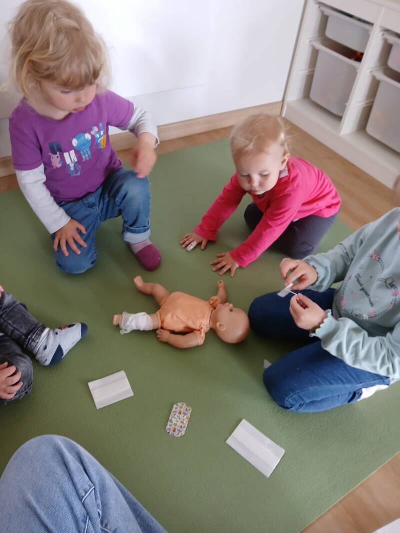 Durch spannende Aktionen haben wir in den letzten Wochen den Arztkoffer für Kinder und den Verbandskasten aus dem Auto entdeckt und durften beides bis in die kleinste Ecke erkunden. Wir haben dabei einiges an Gegenständen, Verbandsmaterialien und Pflastern ausprobiert und kennen gelernt. Jeder der wollte durfte die Rolle des Patienten spielen und die "WUNDEN" wurden gegenseitig untersucht oder auch versorgt. Auch unsere Lieblinge wie die Puppe und der Teddybär, die uns in unserem Alltag begleiten, wurden mit dem Stethoskop, dem Fieberthermometer und der Spritze behandelt.