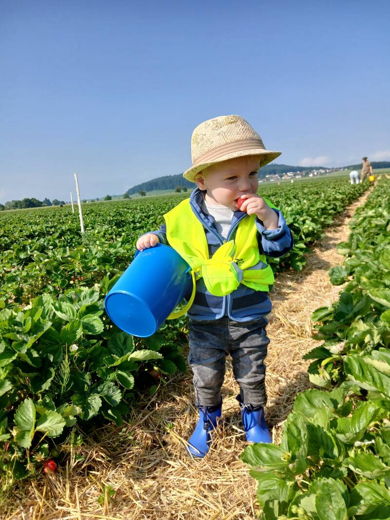 Sonne, Regen, Wasser und Sauerstoff waren in den letzten Wochen unsere Begleiter bei den Entdeckungstouren. Kleine und große roten Früchte konnten wir Anfang Juni auf dem Erdbeerfeld in Verna mit Sonnenschein auf den Rücken ernten und natürlich auch zwischendurch mal probieren. Ältere Damen und Herren haben uns dabei neugierig beobachtet, mal was gefragt und uns auch ein bisschen geholfen, den großen Eimer zu füllen. Nach dem Ernten haben wir dann noch eine Kollegin von Vanessa mit dessen Betreuungskindern getroffen und auf dem Parkplatz unser Mittagessen auf der Picknickdecke zu uns genommen.