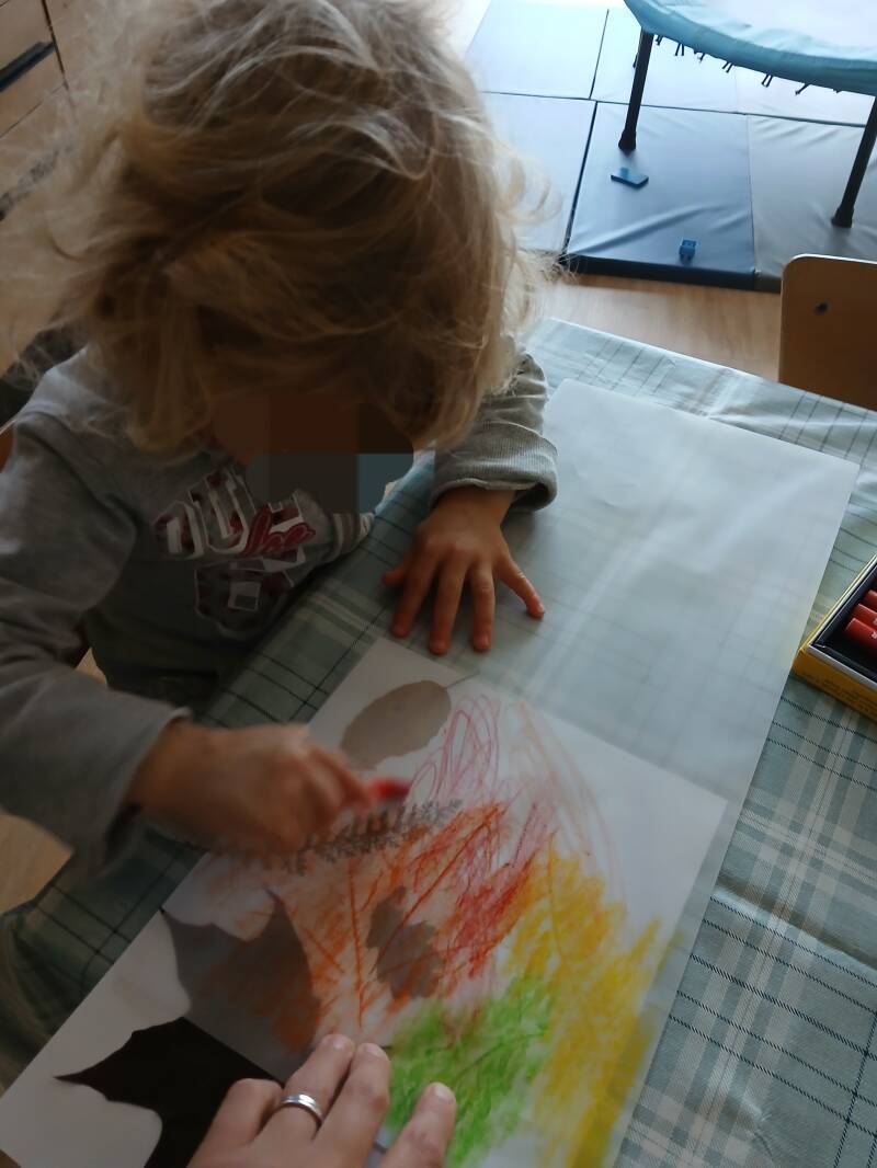 Der Erkundungsraum der Natur ist sehr vielfältig und spannend für die Kinder. Es gibt Regentage wo große Pfützen entstehen, es fallen die bunten Blätter und Kastanien mit denen gebastelt und gespielt werden kann, es gibt die tollen Farb- und Schattenspiele mit der Sonneneinstrahlung und noch vieles mehr... Die Kinder nehmen das alles wahr und lernen die Eigenschaften der Natur mit ihren Sinnen kennen. Aber nicht nur die Natur wurde erkundet sondern auch das Thema Fingerfarbe war für die Kinder ein Highlight. Bei einigen Kindern war es der erste Kontakt mit der Fingerfarbe.