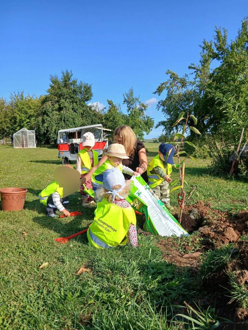 Neben dem Ernten von unserem wertvollen Obst haben wir durch eine Nominierung von Bianca Heinze mit ihrem Heinze-Hof bei der Baum- Challenge teilgenommen und haben mit der Unterstützung durch meine Familie und einem Papa der neuen Eingewöhnung, in unserem Garten am Fahrradweg, einen Kirschbaum gepflanzt. Die Kinder haben dadurch einen kleinen Einblick in den Wachstum von einem Obstbaum bekommen und wir stärkten den Gruppenzusammenhalt. Jeder hat geholfen den Baum ein neues zu Hause zu geben, ihm ein Loch zu buddeln, ihn einzupflanzen beim wurzeln zu helfen um später ein großer starker erntereicher Baum zu werden. Aus einer "Social- Media- Welle" wurde eine tolle und erfahrungsreiche Lernwelt für Kinder gestaltet. Danke für die Nominierung!