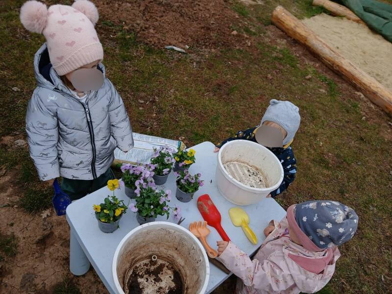 Im Hier und Jetzt erfahren die Kinder, z.B. die Eigenschaft von Erde, den Blumensamen und der Blume kennen.